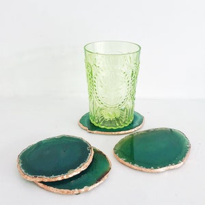 Green Agate Coaster with Rose Gold Leaf Edge. Handmade Rounded Crystal Geode Coaster Set.